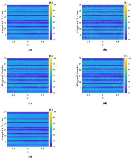 For the sake of further verifying the robustness of the multi-parameter regularization, we have conducted the simulation experiment using two-dimensional brightness temperature image. The original image is shown in Figure 9a, where there are thirty brightness temperature bands of different ocean regions in the along-track direction. Because the result of a single measurement for the Aquarius satellite has only three brightness temperature bands, the original image comes from the results of ten measurements, which are randomly selected from the L-band brightness temperature data for the H polarization between 19, August and 21, August. When the variance of the additive Gaussian noise is set as σ2 = 0.01 max (Vi), the reconstructed image by different regularization methods in the alias-free field of view are presented in Figure 9b–e. Figure 9 indicates that there are obvious oscillation ripples for the inversion results of the TV, Tikhonov, and band-limited regularizations. Compared with the above three regularization methods, the oscillation ripples for the inversion result of multi-parameter regularization are effectively suppressed.