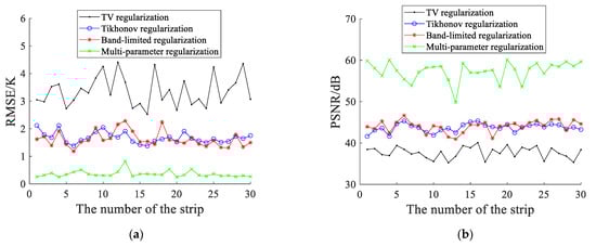 To quantitatively analyze the reconstruction error in Figure 10, we calculated the performance (RMSE and PSNR) for each strip in the along-track direction. The relation between different strips and the performance of the regularization methods is presented in Figure 11. In Figure 11, the horizontal axis denotes the serial number of the strip, and the vertical axis is the RMSE and PSNR for the corresponding strip. Figure 11 indicates that when the strip changes, the performance of the TV regularization is obviously worse than other regularization methods, and the RMSE and PSNR for the band-limited regularization are close to those for the Tikhonov regularization. Moreover, even though the strips are different, the multi-parameter regularization has a considerably lower RMSE and a considerably higher PSNR than the TV, Tikhonov and band-limited regularizations. In consequence, the simulation experiment results show that the multi-parameter regularization is more robust to the measurement noise interference and the brightness temperature distributions of the observed scenes, which demonstrates the effectiveness of the proposed approach.