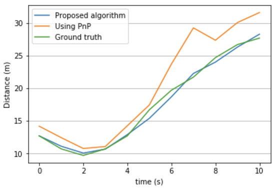 - A comparison between the proposed algorithm and the EPnP algorithm to estimate a detected car position using the KiTTi dataset is presented in Figure 8. The EPnP algorithm is one of the algorithms that depend on one shot estimation [23]. It estimates object position by minimizing the discrepancy between a virtual and a real image using the Levenberg–Marquardt method and is used in many other one-shot based algorithms [6]. From Figure 8, we can notice that the proposed approach slightly outperforms EPnP for distances up to 17 m. However, for distances greater than 17 m, the proposed approach has a better accuracy compared to EPnP algorithm. In addition, it is worth mentioning that EPnP, as well as other one shot-based approaches, will not work in the case of occlusion while the proposed approach can still predict the car position as presented in Figure 6;