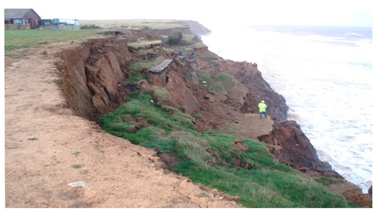The BGS Coastal Landslide Observatory, at Aldbrough, East Riding of Yorkshire, has been monitored since 2001, using a variety of GNSS, TLS, and MMS techniques [24]. The cliff faces northeast, is low (17 m) and of regular height. It consists of glacial till and is actively receding, both by toppling and rotational mechanisms (Figure 6). This work has shown that the cliff is eroding at a rate of up to 3 m per year; both landslides and the direct action of the sea crashing against it cause this erosion [25].