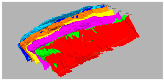 Terrestrial LiDAR surveys have been carried out at the Aldbrough site over a 19-year period from 2001 to 2020 (47 surveys in total), centered on the same section of cliff and platform. The scans have varied in the area covered and [this] has necessitated clipping to an arbitrarily defined datum in order for DTM’s, change models and volume calculations to be produced from them. Since 2012 the utilization of the Riegl VZ-1000, with its improved scan range of 1400 m, accuracy of ±8 mm, measurement rate of 62,000 points/second and high-resolution digital camera, the quality and resolution of the scans and therefore the surfaces created from them has improved considerably (Figure 7). Added to this is the improvement in the acquisition and pre-processing software (RiSCANPro, Infinity), the post-processing software (I-Site Studio, Cloud Compare) and the visualization software (QT Modeler, Global Mapper, GeoVisionary) leading to improvements in the ability to visualize and quantify change more accurately and at better scales (Figure 8). The histogram in Figure 8 shows the colors associated with gain (blue) and loss (red) and also the quantity of each of these values, and where they occur within the model.