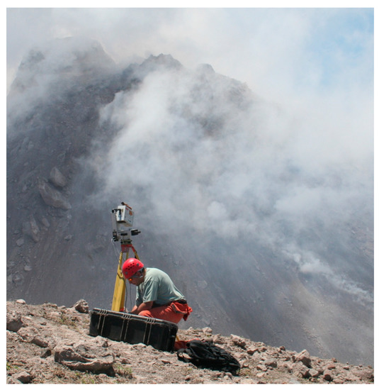 There can be few more hazardous situations than that of monitoring a volcanic andesite lava dome for signs of an impending collapse. Partial collapse of a lava dome generates hot, fast-moving pyroclastic density currents. Monitoring in such circumstances requires that measurements be taken from a distance that minimizes the threat from eruption and from asphyxiation by volcanic gases. The method also needs to be rapid to minimize the time spent by the monitoring team in the hazardous zone [31]. We have used TLS techniques to monitor the growth of the lava dome of the Soufrière Hills Volcano, on the Caribbean island of Montserrat (Figure 11). In May 2006, our measurements helped to identify the changes in lava dome growth rate that directly preceded a total lava dome collapse [32]. The technique utilizes multiple passes of the scanner, as the presence of volcanic gas and ash (from occasional rock falls) clouds can lead to a reduction of 10–20% in the number of scan points returned. Multiple passes increase the chance of “seeing” the dome through these drifting clouds.