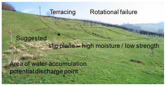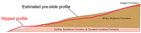 The “complex” landslide is largely caused by the movement of the Whitby Mudstone Formation, which is highly prone to landsliding. The landslide is characterized by shallow rotational failures at the top of the slope in the Whitby Mudstone, which move through an area of translational landslide movement and “cascade” over the in situ Staithes Sandstone Formation feeding into four larger-scale slow-moving (i.e., tens of centimeters per year) lobes of slumped material at the bottom of the slope [33]. Relatively little is known about the hydrogeology of the site. However, a spring line extends across the base of the slope where the Staithes Sandstone overlies the underlying Redcar Mudstone Formation (Figure 13). Figure 14 shows a stylized model (not to scale) of the solid geology and slip surface of the landslide.
