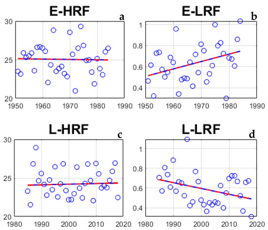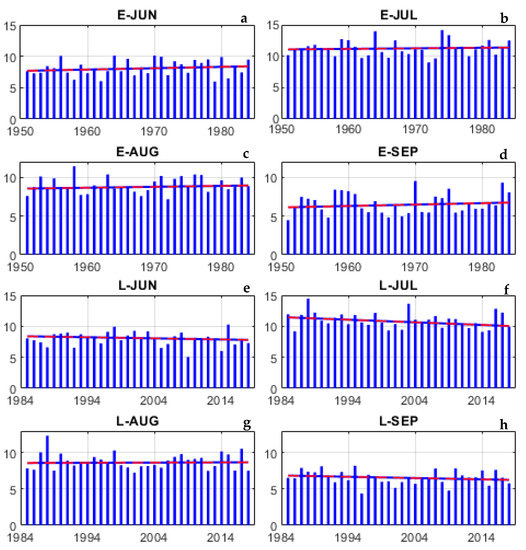 Total rainfall and its duration are an essential aspect of rainfall over a given region. Significant differences are seen in the monthly mean rainfall trends during the two different periods (Figure 2). All the summer months display an increasing trend of rainfall during the E-period (Figure 2a–d). In contrast, June, July, and September months show a decreasing trend during L-period (Figure 2e–h). The rainfall contributions from the summer months are as follows: July (~24%), August (~21%), September (~14%), and June (~14%), respectively, to the annual rainfall [30]. In the recent 34 years, the decreasing trends of rainfall in July and September months are much steeper than the other months (Figure 2). Overall, the ISMR displays a clear contrast in the monthly rainfall trends in the two periods.