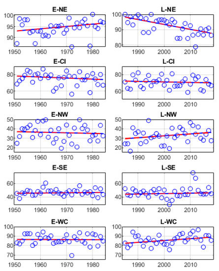 Figure 3 displays the trends of summer monsoonal rainfall days over various regions in India (see Figure 1a). The number of rainfall days are notably declined over NE in L-period as compare to E-period. Such a strange shift is observed over the NE region, which is known for its dense forest region and the world’s wettest point, Cherrapunji. Over CI the rainfall days are continuously decreasing (Figure 3). However, the regions, e.g., NW, SE, and WC, show an increasing trend for the L-Period (Figure 3 right column). In contrast, for the E-Period, NW displays a decreasing trend, while SE and WC show no trend (Figure 3 left column). The number of rainy days over different climatic zones demonstrates a remarkable difference in trends during E-period and L-periods. Overall, the number of rainfall days, as well as rainfall quantity, declined over CI and NE India during JJAS (Figure 2 and Figure 3) during L-period. It is interesting to note that the number of rainfall days decreased over the southern region of WC (Figure 1c), while over total WC number of rainfall days increased in L-period (Figure 3, bottom right). These results do not dilute the fact that the cases of extreme rainfall events are increasing over Central India [10]. From Figure 2 and Figure 3, it seems the total number of rainfall days used to be linearly related to the total rainfall during the E-Period, but this does not hold during L-Period. Figure S1 shows similar trends for two periods as in Figure 3, where we consider the IMD definitions of rainy days (rainfall on each grid > 2.5 mm). Such criteria do not affect our analysis even if we consider rainfall over a grid > 0.5 mm or 2.5 mm to define a rainy day.