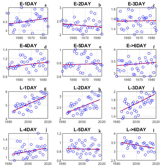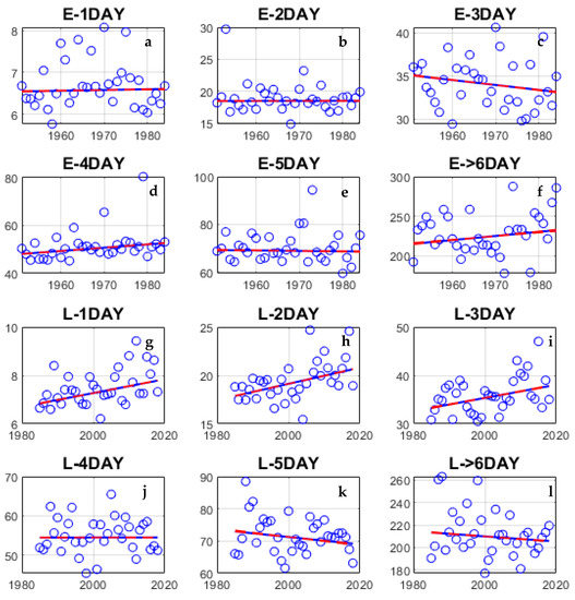 We evaluated the continuous rain events and continuous rainfall magnitude over Indian region for two periods. The frequency of continuous rainfall events increased for 1DAY, 4DAY and ≥6DAY for E-period (Figure 4a,d,f). However, it is decreased for day 2 of rainfall (Figure 4b), and almost constant for 3DAY and 5DAY (Figure 4c,e). For, L-period, trends in continuous rain events frequency escalated for 1 to 4DAY (Figure 4g–j), and almost constant for 5DAY (Figure 4k), while decreased for >6DAY (Figure 4l). In recent years, the frequency of continuous rain events de-escalated for a higher number of days (>6DAY). The magnitude of Sens slope in E-period (0.01 for 1DAY and 0.004 for ≥6DAY) is smaller than the L-period (0.04 for 1DAY and −0.01 for ≥6DAY) for rain event frequency. A well-known local name for the frequency of continuous rainfall, Jhad, in northern Indian villages, is fading in recent times. Some of the well-known recent flood events (such as 26–28, July 2010; 15–16 June 2013) over India lasted for 1DAY to 3DAY, which is also evident from Figure 4g,i) during L-period.