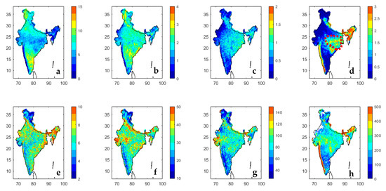 Timely information on hydrological variables (e.g., rainfall, soil moisture) in June is crucial for the plantation of rice crops. Soil moisture, evaporation, and runoff are the important hydrological aspects of monsoonal rainfall. The hydrological processes of the surface and sub-surface depend on the land cover and land use (LCLU, Figure S5), which vary erratically over the desert, forest, crops, shrubs, and bare land regions [49]. Hydrological variables are being averaged over a uniform LCLU (Figure S5 and Figure 11) e.g., Agricultural land over Punjab (lon = 75.15°E, lon = 76°E, lat = 30.1°N, lat = 30.4°N), shrub land over Rajasthan (lon = 70°E, lon = 70.75°E, lat = 26.75°N, lat = 27.25°N), forest over western Ghats (lon = 74°E, lon = 75°E, lat = 14°N, lat = 15°N), deciduous over Assam (lon = 92.9°E, lon = 93.4°E, lat = 26°N, lat = 27°N), crop land in Utter Pradesh (lon = 78°E, lon = 79°E, lat = 27°N, lat = 29.5°N), and Lucknow in Utter Pradesh (lon = 80.8°E, lon = 81.25°E, lat = 26.65°N, lat = 27°N). LCLU does not change much over a period of 10 years. The selected regions of uniform LCLU, well represent the 5-homogenous region (Figure 1a). Figure 11a–f displays the daily variations of surface precipitation, volumetric soil moisture for layer-1 (0–7cm), and evaporation over 6-selected regions dominated by cropland, deciduous, forest respectively for summer 2015 and 10 years (summer 2009–2018, Figure 11g) over cropland of northern India. The volumetric soil moisture is associated with the soil classification and soil layers/depths. On a daily scale, the rainfall and soil moisture correlation varies from 0.50 to 0.87, while rainfall and evaporation correlate −0.46 to 0.87 (Table 3). There are quite variations in monsoonal rainfall (called an active-break cycle), but the soil moisture keeps low variations. Soil moisture (slowly varying variable) varies smoothly compared to rainfall and picks up suddenly on a daily time scale. For a longer time scale (10 years, Figure 11e), we did not find any new insight than the individual years. During extreme rainfall cases, the soil moisture does not increase in the same proportion as low/moderate rainfall because runoff, evaporation, and impervious of soil/LULU limits the infiltration of water into the soil (Figure 11). The 10-year time series of the hydrological variables do not add much except yearly seasonal fluctuations (Figure 11g). Soil moisture possess have a good correlation with rainfall over cropland, deciduous forest and scrublands. Continuous rainfall for a short duration (e.g., 2 days, 3 days) enhances the soil moisture dramatically. In contrast, small fluctuations in rainfall do not influence the slowly varying soil moisture significantly. Heavy and extreme rainfall enhances flooding and runoff as compared to soil moisture [50]. The percolation of water into the soil depends on the rainfall duration, intensity, and continuity. A moderate to low rainfall will enhance the soil moisture up to a great depth. However, it hard to relate soil moisture to continuous rainfall for more than 2 days, because soil moisture values never reach zero, while a region can receive zero rainfall, which is very common news.