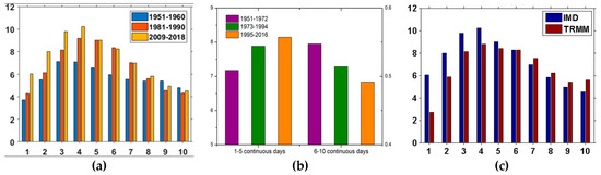 To analyze rainfall contribution from prolonged continuous rainfall, we compared the rainfall contribution (expressed in percentage) to the ISMR, up to continuous 10-days rainfall from 1951 to 2018 (Figure 8a) for 3 decades. In the recent 10 years (2009–2018), ~60% of rainfall was contributed from 2 to 6DAY of continuous rainfall, which is 20% more than the rainfall contributed during 1951–1960 from the same number of continuous rainfall days. Furthermore, it is obvious from the figure that rainfall contributed from a large number of continuous rainfall days (>8DAY) decreased in recent years. On the average of multi-years and 1–5 continuous rain days, rainfall percentage increased by 0.9% from 1951–1972 to 1995–2016, while the rainfall is decreased by 0.05% for 6–10 continuous rainfall days (Figure 8b). The difference in the rainfall percentage is quite small for 6–10 continuous rainfall days. Thus, for comparison, TRMM rainfall is compared for the recent decade, which turns out that the TRMM underestimates the rainfall as compared to IMD rainfall (Figure 8c). One known caveat of TRMM rainfall is underestimating orographic rainfall (e.g., rainfall over the Western Ghats) [25]. Averaged rainfall over Central India shows a strange trend (decreasing) when averaged for more than 20 years of span (Figure S3). These results also support that the rainfall is shifting towards a lesser number of continuous rainfall days with higher magnitudes. The change in rainfall duration and quantity also supports that the heavy rainfall events only last for shorter durations.
