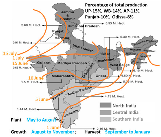 Uttar Pradesh, West Bengal, Andhra Pradesh, Punjab, and Odisha are the top five states, and those grow staple rice crop. It is observed that in some of the states, plantation of rice starts before the arrival of monsoon, which is counted in the category of an early plantation of rice crops. Notably, all states in India grow rice, except western Rajasthan, which is a desert region. In some years, the very first monsoonal rain reach over the northern states quite late from the onset date of monsoon, which may delay rice plantation by up to early August [48].