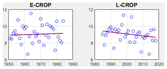 In the L-period, the magnitude of heavy rainfall frequency (HRF) increases throughout India, at the cost of light rainfall frequency (LRF) (Figure 6c,d). However, the same logic does not work for the E-period. The slopes of LRF in two periods (E and L) are almost the same, except for the opposite sign (Figure 6b,d). In particular, the magnitude of light rainfall dwindled in the L-period while the magnitude of heavy rainfall increased marginally. The light rainfall is beneficial to grow crops by recharging the upper soil layer (1 to 10 cm). The rainfall decreasing trend in the L-period for LRF may indicate an increased number of non-rainy days. An increase in the number of non-rainy days may shift the total rainfall distribution towards the heavy rainfall end.