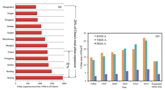 Figure 1a, the 12 cities with the largest urban expansion area in China account for 20% of China’s total urban expansion area. Most of these cities belong to the three fastest-growing urban agglomerations in China, namely, the Beijing–Tianjin–Hebei urban agglomeration (BTHUA), Yangtze River Delta Urban Agglomeration (YRDUA), and Pearl River Delta urban agglomeration (PRDUA). From the 1980s to 2015, the urban expansion of these three urban agglomerations was almost equal to that of the 1980s (