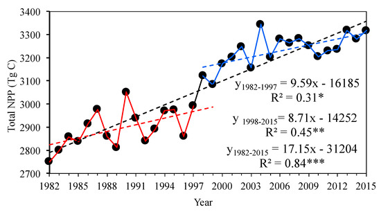 p < 0.05) at a rate of 9.59 Tg C/yr. After 1997, the rate of increase in annual total NPP decelerated, reaching 8.71 Tg C/yr, and the trend was significant (R