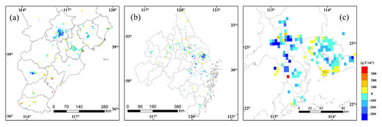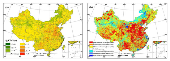 Figure 4). The NPP presented an increasing trend in most areas of China, and the pixels whose NPP change rate was greater than 5 g C/m²/yr were mainly distributed in the central, eastern, and southern regions. Moreover, the pixels with a decreasing NPP trend were mainly distributed in northern and northwest China and in the Yangtze River Delta and Pearl River Delta regions along the coast. Among them, the NPP in the Yangtze River Delta and Pearl River Delta decreased significantly (
