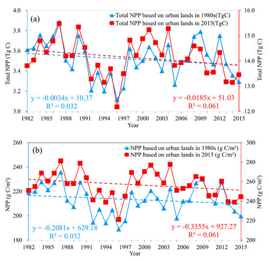 Figure 5a, the total NPP of the 1980s and 2015 urban lands both showed a slightly decreasing trend. However, within the 2015 urban lands, the total NPP decrease rate was −0.0185 Tg C/yr, which is higher than that of the 1980s (−0.0034 Tg C/yr). The average NPP has the same trend as the total NPP, and the decrease rates of the average NPP within the 1980s and 2015 urban lands were −0.2081 g C/m