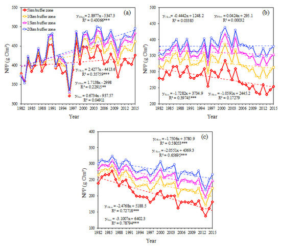 Figure 9a, the NPP variations in buffer zones of urban lands in the BTHUA indicated that the NPP increased in different buffer zones. With the expansion of the buffer zone in the BTHUA, the NPP trend changed from a nonsignificant (