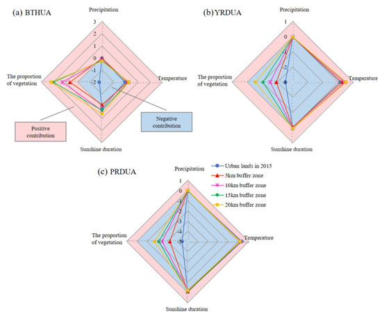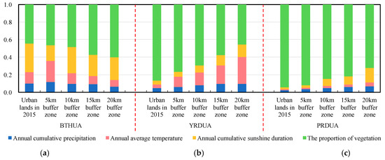 Moreover, we evaluated the importance of the annual cumulative precipitation, the annual average air temperature, the annual cumulative sunshine duration, and the proportion of vegetation to the NPP in the urban lands, 5 km buffer zone, 10 km buffer zone, and 20 km buffer zone of the BTHUA, the YRDUA, and the PRDUA (