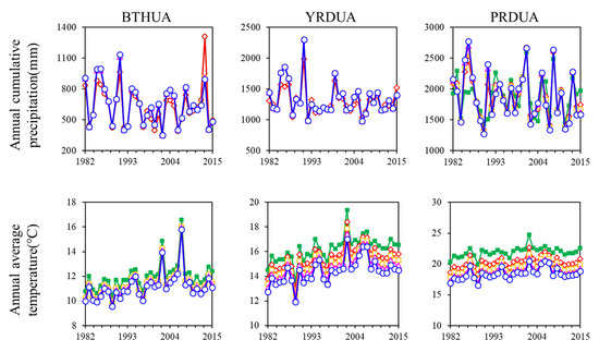 The annual cumulative precipitation, the annual average air temperature, the annual cumulative sunshine duration, and the proportion of vegetation in the BTHUA, the YRDUA, and the PRDUA.