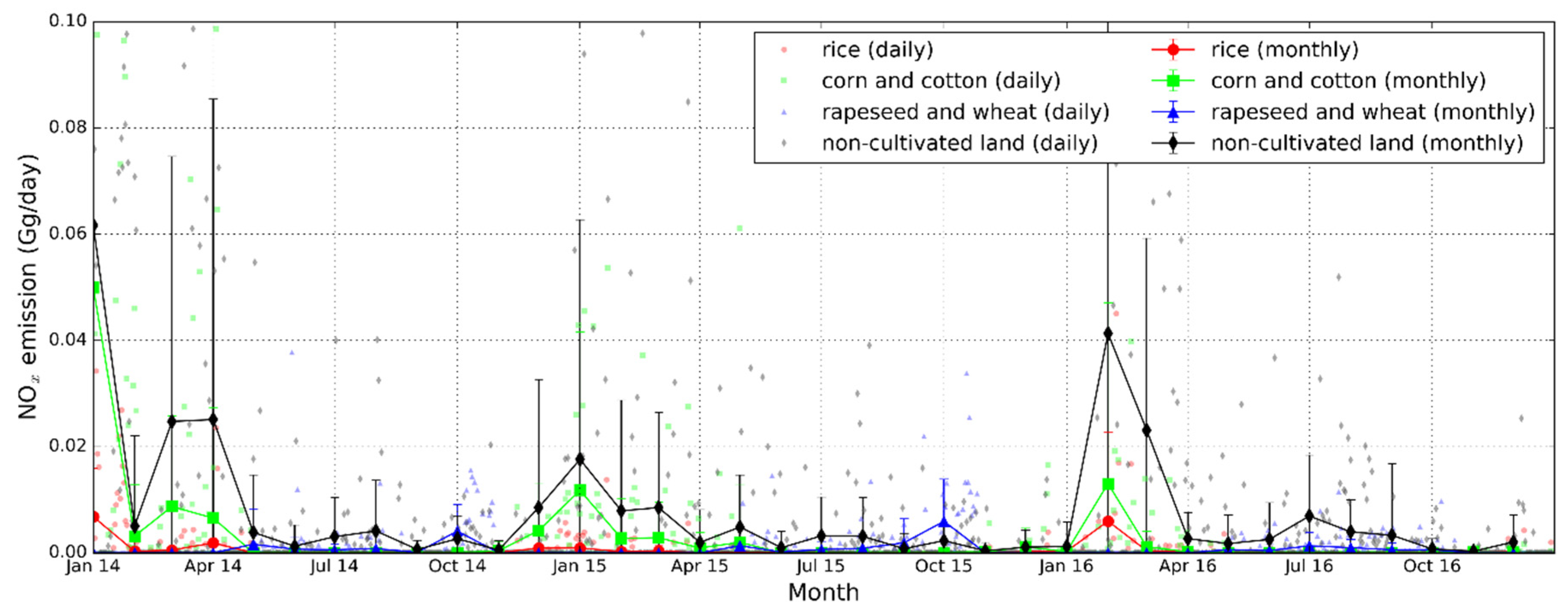 - Cao, Y.-s.; Tian, Y.; Yin, B.; Zhu, Z. Investigation on NO Emission from Agricultural Soils. Soils 2013, 45, 791–799. [Google Scholar]