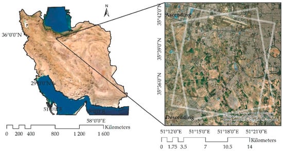 The Tehran basin is located in the north of Iran. It is surrounded by the Alborz mountain to the north and Arad and Fashapouyeh to the south. Based on previous studies, this area suffers from a high rate of subsidence caused by the withdrawal of groundwater [5,34,35]. This can cause many problems for PTs. To apply the PSI technique, a region with a center of 35.6281° latitude and 51.2915° longitude and a radius of 10 km in the south west of the Tehran metropolitan area, which consists of both urban and rural areas, was considered (see Figure 1).