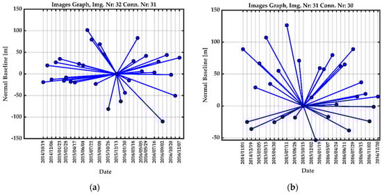 For the processing of each dataset, a single master based on minimizing the spatiotemporal decorrelation criterion was selected. Figure 2 indicates the configuration of the interferometric image datasets, where each point shows an image and each line between two points represents an interferogram. Figure 2a,b show a selected single master image on 13 December 2015, and 15 October 2015, in ascending and descending paths for the S-1A datasets, respectively. Additionally, Figure 2c,d show a selected single master image on 27 May 2015, and 17 February 2015, in ascending and descending paths, respectively, for the CSK datasets.