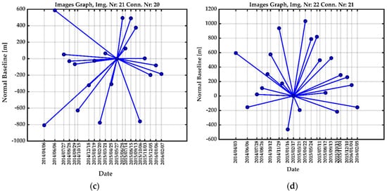 Image graphs for each time series data stack of (a) S-1A ascending (Track 28); (b) S-1A descending (Track 35); and (c) CSK ascending; (d) CSK descending, which show the 2D spatiotemporal baseline spaces. Each point displays a scene, and each line displays an interferogram with respect to a single master.