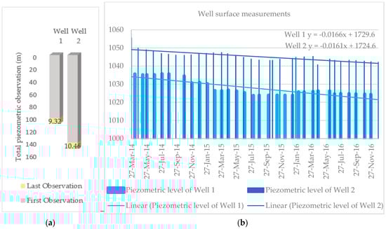 Piezometric measurements. (a) The first (27 March 2014) and last (27 December 2016) observations of piezometric depth; (b) Piezometric time series observations over about three years (early 2014 to late 2016).