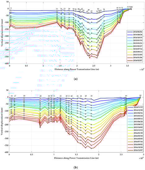 Spatial subsidence profiles of power towers (PTs) along the selected transmission line based on (a) CSK and (b) S-1A vertical time series results. The gray points show the detected PTs, and the numbers indicate the numbers of them along the line, which show different profiles in different time series.