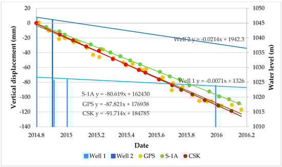All the time series trends are presented through a comparative chart in Figure 10, where the vertical components of the InSAR analyses are compared to the GPS vertical measurements. The trend lines for CSK and S-1 are rather similar to the linear trend of the whole GPS observations (see Figure 8). Information for all the piezometric observations during the same time interval for both wells is shown as light and dark blue bars. Each bar shows the water level height from the entire well depth. The seasonal changes in water level have a decreasing trend, which also proves the PSI results.