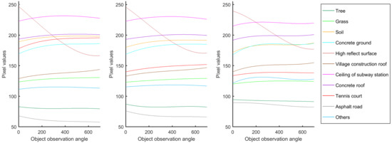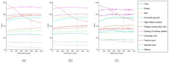 Figure 4 displays the spectral reflectance of 11 land covers in three bands. Each curve means the average value of all samples in one class changes with observation angles. It shows that every land cover exhibits different spectral reflectance along the changing observation angles. Some spectral reflectance curves may increase, while others may decrease. Some may be similar to specular reflection, while some others may be similar to diffuse reflection. Such information can obviously increase our capability in land cover recognition and classification.