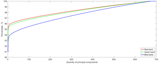 Cumulative total variance accounted for by the 700 principal components under the red, green, and blue band.