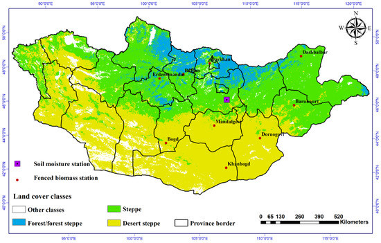 The land cover data were from 2010 Mongolia Land Cover Map produced by the Mongolian National Remote Sensing Center (NRSC) [38]. The Mongolian grassland was divided into forest steppe (FS), steppe (ST), and desert steppe (DS) zones, and the differences and changes of multiple drought results in different zones were analyzed.