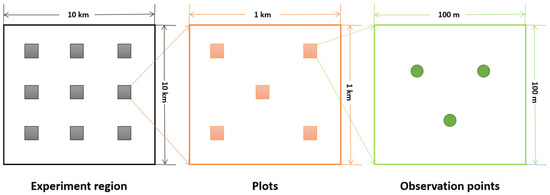 Field soil moisture values were measured using a time domain reflectometer (TDR 300) in a fixed experimental area located in Bayan Soum, Tuv province, Mongolia, as shown in the red box in Figure 1. The unit of soil moisture is represented as a volumetric percentage (%/%). Records were obtained for each dekad from the middle of June to late September in 2014. The field campaign comprised a 10 × 10 km region of the steppe zone. In total, 9 plots (1 × 1 km) were selected in the study area. There were 5 observation points (100 × 100 m) in each plot, and measurements were repeated three times. The design for the field sampling plan is shown in Figure 2. The soil moisture data from 12 and 20 cm depths were collected from collaboration experiments by the Information and Research Institute of Meteorology, Hydrology, and Environment (IRIMHE) and the Institute of Remote Sensing and Digital Earth, Chinese Academy of Sciences (RADI).