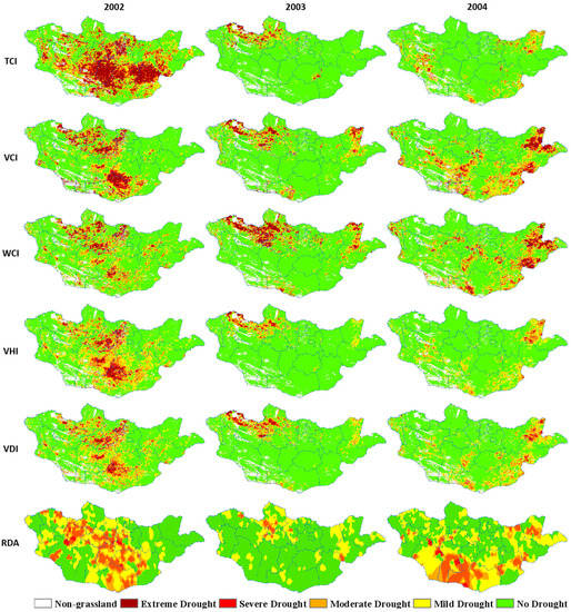 Generally speaking, as shown in all indices, the drought was serious in July 2002, while the drought in 2003 was milder than that in 2002 and 2004. The TCI indicated that most areas had severe drought, which was different from the drought degree of the RDA map for the north, east, and west. The drought extent indicated by the TCI was heavier than that in 2002. The VCI indicated that severe drought occurred in some central areas in 2003 and 2004, showing few moderate and mild droughts; additionally, the eastern and southern regions were less affected. In the northern and eastern regions, the WCI was consistent with RDA map and similar to the VCI distribution in other regions. With regard to the VHI and VDI, the consistency was higher with the RDA map, and the latter was more consistent with RDA map in the eastern, central, and southern regions in 2003 and 2004. In general, the proposed VDI could provide a coherent description of the field-based drought conditions throughout Mongolia.