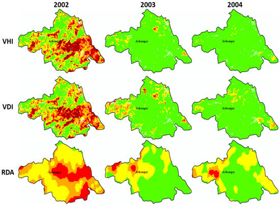 In general, the spatial distributions of drought were more consistent between the VDI and RDA than with the VHI. Temporal changes of drought from 2002 to 2004 were detected by the VDI, VHI, and RDA. However, some regional differences still existed when viewing fine comparison analysis of them.