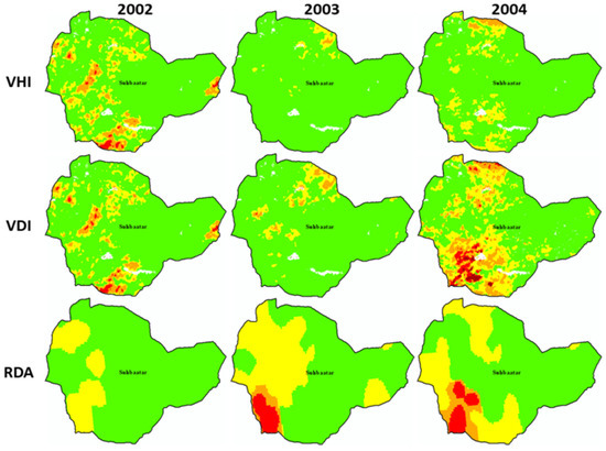 Drought occurrence in the Omnogovi province demonstrated a similar spatial distribution in 2002, as shown in Figure 6. The VDI and VHI precisely detected the drought region from the RDA map. In 2003. “no drought” was indicated by the VHI and RDA, while the VDI showed few drought events. The RDA demonstrated heavy drought in the mid-northern region, but almost no drought was shown by the VDI and VHI in 2004.