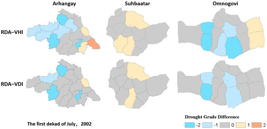 Drought grade differences between the averaged VHI, VDI, and RDA (RDA–VHI, RDA–VDI) at the county level in the first dekad of July, 2002, for three typical provinces.