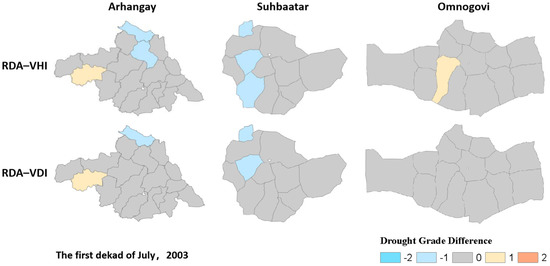 Drought grade differences for the averaged VHI, VDI, and RDA(RDA–VHI, RDA–VDI) at the county level in the first dekad of July, 2003, for three typical provinces.