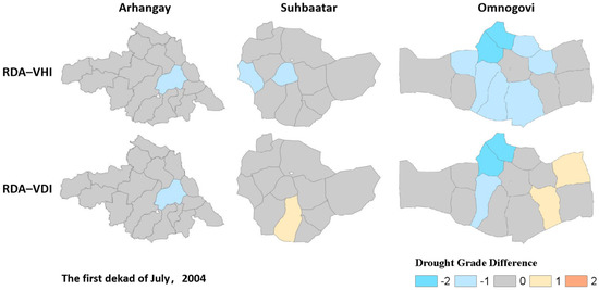 Drought grade differences for the averaged VHI, VDI, and RDA (RDA–VHI, RDA–VDI) at the county level in the first dekad of July, 2004, for three typical provinces.