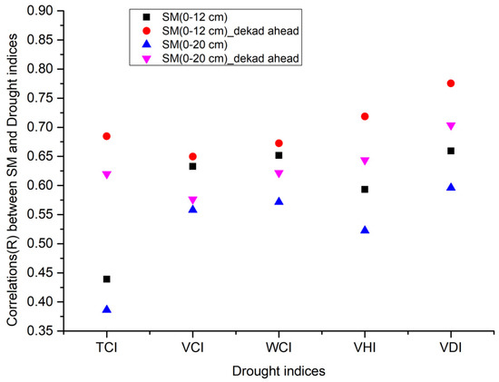Because soil moisture typically cannot be used by vegetation or grass immediately, there is a lag from a change in water level to a vegetation response. Some results showed that the vegetation variations indicated by the NDVI were lagged responses to soil moisture [35]. We also examined the correlation coefficients between field soil moisture and the RS-derived drought indices calculated with one dekad lag. As shown in Figure 10, the soil moisture one dekad ahead was more closely related to the current drought index than the current soil moisture, and an increasing R was demonstrated. For the 12 cm depth, the R increased from 0.66 to 0.78; for the 20 cm depth, the R increased from 0.60 to 0.70 for the VDI. The lag effect was determined according to these results. However, when we carefully studied and observed the changes of the relationships among TCI, VCI, and WCI in Figure 6, it seems that the main contribution was from the TCI, with the R value increasing from 0.44 to 0.68 at 12 cm depth and 0.39 to 0.62 at 20 cm depth. The correlations showed little change between the VCI or WCI and soil moisture compared to soil moisture one dekad ahead (R values for the VCI ranged from 0.63 to 0.65 at 12 cm depth; R values for the WCI ranged from 0.65 to 0.67 at 12 cm depth). Similar results can be found for the 20 cm depth. In other words, the lag effect of the vegetation index on soil moisture was not obvious for the VCI or WCI at the one-dekad scale. One possible explanation is that the time scale of drought indices was a dekad, while field soil moisture values came from a certain day; the dekad average for the VCI and WCI weakened the time change information, while dekad average for the TCI indicated a faster response to soil moisture changes. The daily drought products of satellite images need to be further studied.