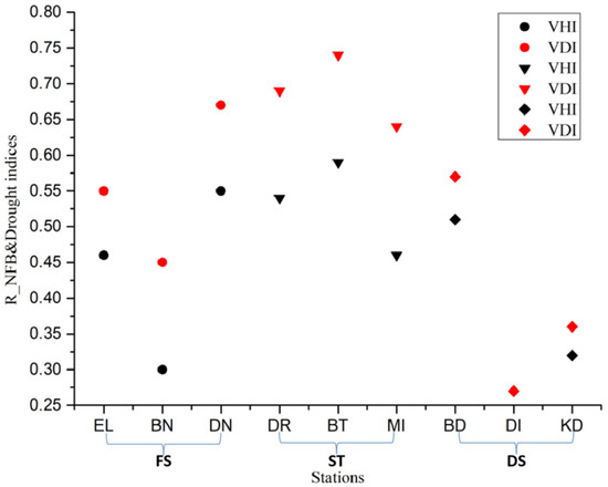Further, to compare the VHI and VDI, the correlation between the VDI and NFB was significantly higher than that of the VHI (average R value increased by about 0.11 overall), especially for FS and ST sites, as shown in Figure 11. However, for the DS site, the increase was not obvious, the correlations between each index and the NFB were relatively small, especially for DI and KD sites, and the maximum correlation coefficient was 0.36. The correlations between the VDI and NFB were slightly higher than those between the VHI at DI and KD sites.