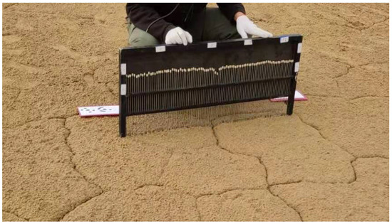 Field soil sampling and ground measurement campaigns were carried out on 21 August and 22 August 2020, to coordinate with the time of the SAR satellite passing through the study area. We selected 13 regions with different surface roughness, and the position distribution is shown in the green triangle in Figure 1. Multiple surface and subsurface (10 cm) soil samples were collected from each sampling site, and the corresponding GPS coordinate was recorded. A total of 70 soil samples were sealed in aluminum sample boxes to maintain their natural state and carried to the laboratory for further measurement. The surface roughness was measured using a pin profilometer in different directions at each sampling site (Figure 2). The root mean square (RMS) surface height of all sampling sites ranged from 0.00243 m to 0.0349 m, and the correlation length ranged from 0.0375 m to 0.1425 m.
