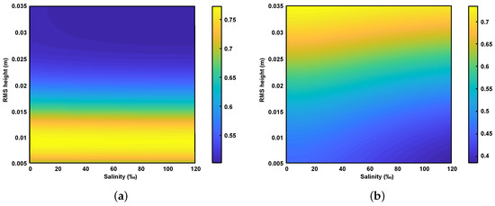 The relationship of the co-polarization ratio with surface roughness and salinity obtained from the simulation of modified dielectric mixing model and IEM model. (a) C-band (5.4 GHz), (b) L-band (1.24 GHz). The RMS height and surface correlation length cover the range of field measurements, and the soil volumetric water content is set at 5%.