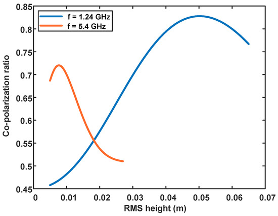 It is worth noting that the variation of co-polarization ratio with roughness shows a difference at two frequencies. To explain this difference, we simulate the co-polarization ratio as a function of surface roughness using the IEM model. The results show that as the surface roughness increases, the co-polarization ratio first increases and then decreases (Figure 9). The same trend is observed at both frequencies, but the position of the inflection point of the curve is different. The inflection point maybe because the single scattering IEM model is not applicable for the current roughness. The sensitivity of electromagnetic waves with different frequencies to surface roughness is inconsistent, so the position of the inflection point of the curve is different.