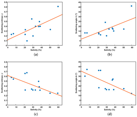 According to the Rayleigh criterion [13], a surface can be regarded as relatively smooth if the wavelength and the RMS height satisfy: . Given the actual range of RMS height in this experiment, the surface of the sampling area can be assumed to be relatively smooth in the L-band, while the influence of surface roughness cannot be ignored in the C-band. Due to the low water content in the sampling area, the electromagnetic waves in the L-band can penetrate below the ground surface at low soil salinity content, which will increase random scattering components. Thus, large H and values are observed in Figure 12c,d when the soil salinity content is low. However, the penetration depth in the C-band is much weaker than that in the L-band [13]. In this case, it can be considered that the surface scattering component is dominant at low soil salinity content, so H and show small values in Figure 12a,b.