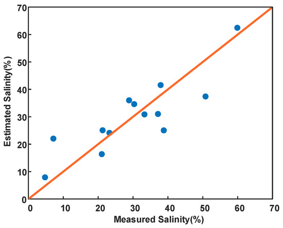 The relationship between the estimated value of the proposed regression model and the measured value of soil salinity.