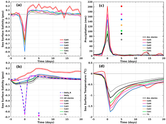 Lagrangian composites relative to TC passage for: (a) daily SSS, (b) eight-day running mean SSS, (c) daily precipitation and (d) daily SST. Panel (a) shows SSS anomaly relative to the reference SSS for the composite average of different intensity categories during the period 2015–2019, from SMAP swath daily raw data (L2C). Panel (b) is as in (a) but using SMAP eight-day running mean data (L3). The dashed blue (purple) line is calculated using SMAP swath daily data with (without) the high surface wind (>15 m s−1) associated SSS removed. The blue and purple dots indicate the maximum negative SSS anomaly for the composite average of all storms with and without the high surface wind associated SSS removed, respectively. Panel (c) shows composite daily accumulated precipitation during the same period with (a). The corresponding dots are the accumulated precipitation on day 0 for different categories. Panel (d) shows composite SST anomaly response relative to the reference SST during the same period with (a). The composited variables are averaged over a 2° × 2° region centered over TC track positions from days −20 to 20. Color shading indicates the standard error of each variable.