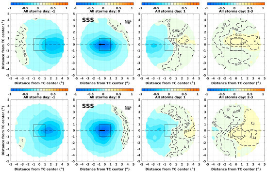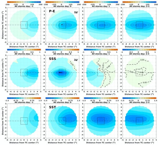 The spatial distribution of the accumulated precipitation–evaporation (P-E) and SSS (and SST) anomalies relative to reference SSS (and SST) in the Northern Hemisphere from days −1 to 3 are presented in Figure 4. The accumulated P-E is computed starting from day −2. The spatial pattern of accumulated P-E is similar to the pattern of the precipitation since the magnitude of evaporation in the TC center is much smaller than that of precipitation. This is consistent with Gao et al. [59] and indicates a substantial large scale atmospheric convergence of moisture is needed to supply the TC rainfall. The accumulated P-E is distributed symmetrically across the track of the storms. Chen et al. [60] point out that the maximum TC rainfall is on the downshear left (right) side of the storms in the Northern (Southern) Hemisphere when the vertical wind shear is more than 5 m s−1. The composite vertical wind shear on day 0 is only 1.45 m s−1, resulting in a relatively symmetric rainfall pattern; ongoing work explores the dependence on the shear direction of the ocean response to TCs.