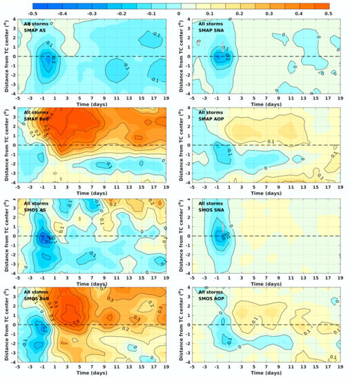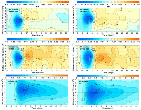 The along-track composite of SSS (SST) response from −4° to +4° to the center between day −5 and day 20 in the Northern and Southern Hemisphere is presented in Figure 7. The SST response is characterized by uniform cooling with the maximum decrease on days 1 to 2. Right (left)-hand side bias is clearly observed in the Northern (Southern) hemisphere, which is consistent with previous studies [11,12,63]. Unlike the SST response, SSS drops primarily during the passage of TCs due to the peak in rainfall. It is worth noting that as the satellite swath SSS pixels under high surface wind are removed, SSS response to relatively intense TCs on day 0 may not be fully considered in the composite calculation. Although TCs produce heavy rainfall, the surface freshening is eventually offset by surface salinification caused by vertical mixing and upwelling, which explains the right (left)-hand side bias distribution of the surface salinification in the Northern (Southern) Hemisphere. Ultimately, the passage of TCs over the ocean results in a cooler and saltier surface, with recovery time more than 15 days. Both SMAP and SMOS satellite data reveal similar SSS response features during and after the passage of TCs, which makes the results more reliable, although the magnitude of the salinification after the passage of TCs is higher when SMOS satellite data are used.