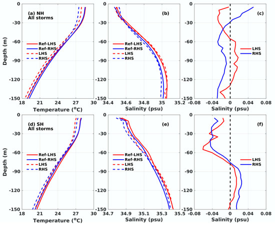 Composite temperature and salinity profiles during the reference time period (solid line) and averaged 1–5 days after the passage of the TCs (dashed line) for all storms during 2002 to 2019 in the Northern (a,b) and Southern (d,e) Hemisphere, with in-situ data from Argo floats. The salinity difference between the composite average during reference time period and days 1 to 5 in the Northern and Southern Hemisphere is presented in (c,f), respectively. LHS (RHS) shows the composite profiles within the left (right) 2° × 1° box of the center. Color shading indicates the standard error of each variable.