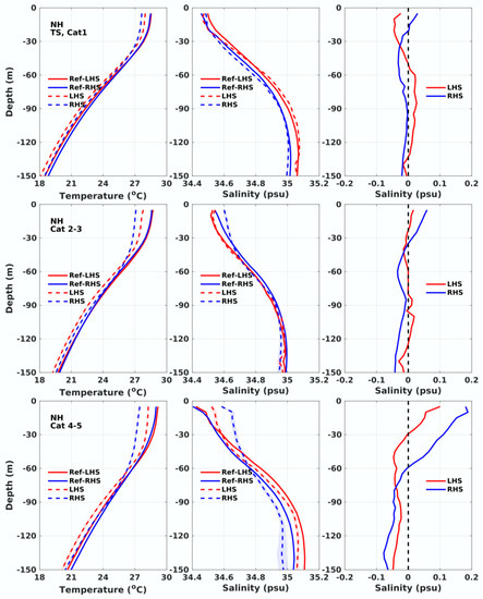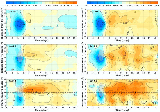 The same with the upper panels of Figure 8, except that the Argo profiles during TS and Category 1 TCs (upper panels), Category 2–3 (middle panels) and Category 4–5 (lower panels) in the Northern Hemisphere are composited.
